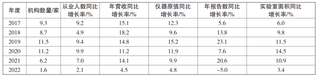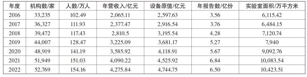 本文收集整理了2016—2022年度國家市場監(jiān)督管理總局發(fā)布的檢驗(yàn)檢測服務(wù)業(yè)統(tǒng)計簡報數(shù)據(jù),如表1和表2所示,近年來我國檢驗(yàn)檢測行業(yè)除2022年報告數(shù)同比下降5.0%外,在機(jī)構(gòu)數(shù)量、從業(yè)人數(shù)、年營收、儀器設(shè)備資產(chǎn)原值、實(shí)驗(yàn)室面積等指標(biāo)上均實(shí)現(xiàn)了逐年增長,表明我國檢驗(yàn)檢測行業(yè)整體仍處于成長期,吸引了大量資本入局。但2022年度各項(xiàng)指標(biāo)增速均明顯放緩,反映了行業(yè)已告別野蠻擴(kuò)張期,迎來發(fā)展拐點(diǎn),市場競爭加劇、投資熱情下降,淘汰洗牌和轉(zhuǎn)型升級將成為行業(yè)后續(xù)主旋律。