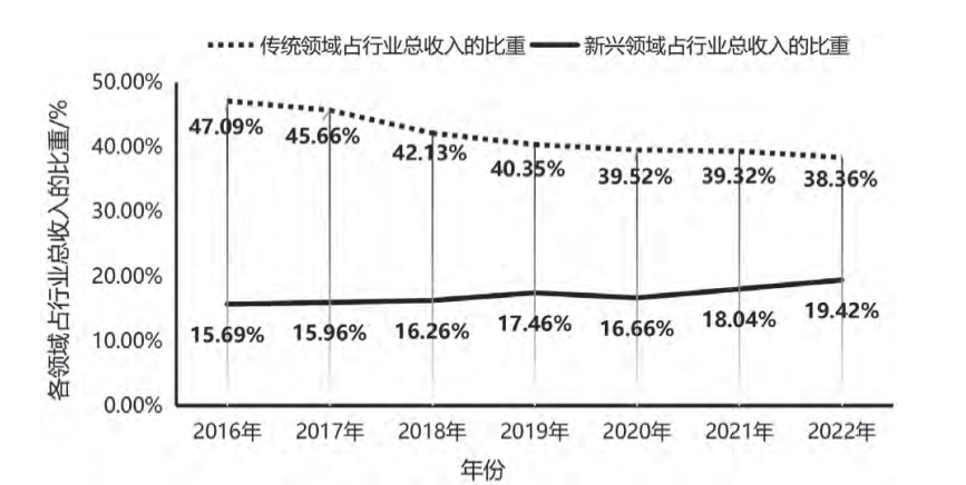 圖1 2016—2022年新興領(lǐng)域和傳統(tǒng)領(lǐng)域行業(yè)營收占比情況
